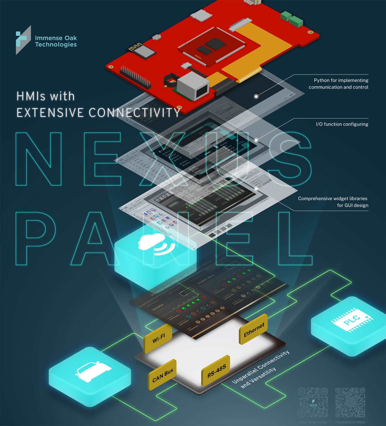 I moduli HMI Immense Oak Technologies supportano nativamente numerose I/O, come GPIO, PWM e ADC. Per le esigenze di comunicazione vengono fornite specifiche Extension Boards da installare sopra la scheda di controllo standard. Sono personalizzabili a seconda delle necessità del cliente e supportano Ethernet, WiFi, BT, RS-485, RS-232, CAN Bus e combinazioni di queste interfacce.